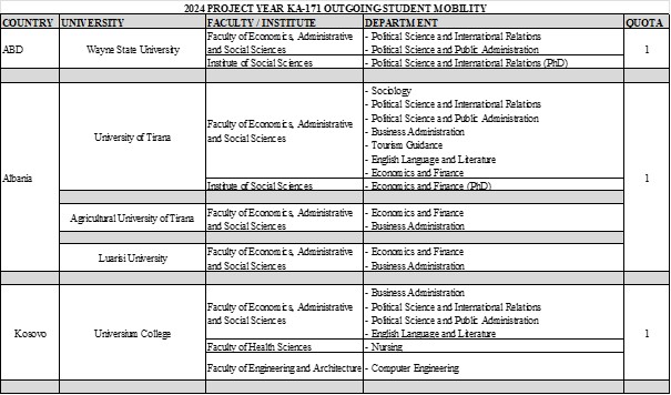 2024-1-TR01-KA171-HED-000237633 KA-171 Project Erasmus+ Student Mobility Applications will be accepted for our students who would like to benefit from Erasmus+ Studying Mobility from February 13 to February 28, 2026, through the e-government turn portal system (https://turnaportal.ua.gov.tr/). Students of the departments specified below can apply for the relevant project.