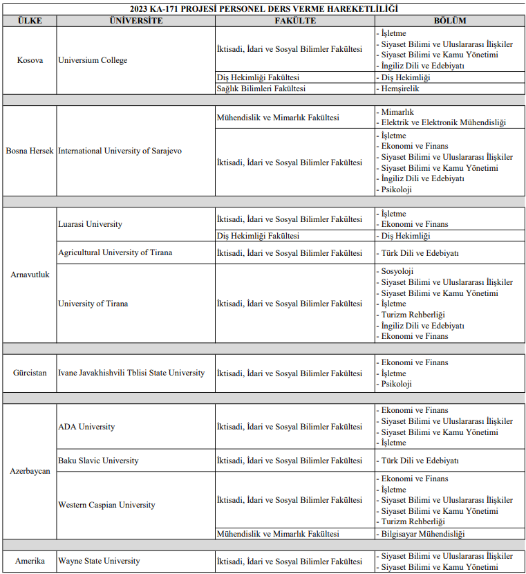 2023 sözleşme dönemi KA-171 Erasmus+ Personel Ders Verme Hareketliliği kontenjan bilgisi için lütfen tıklayınız.